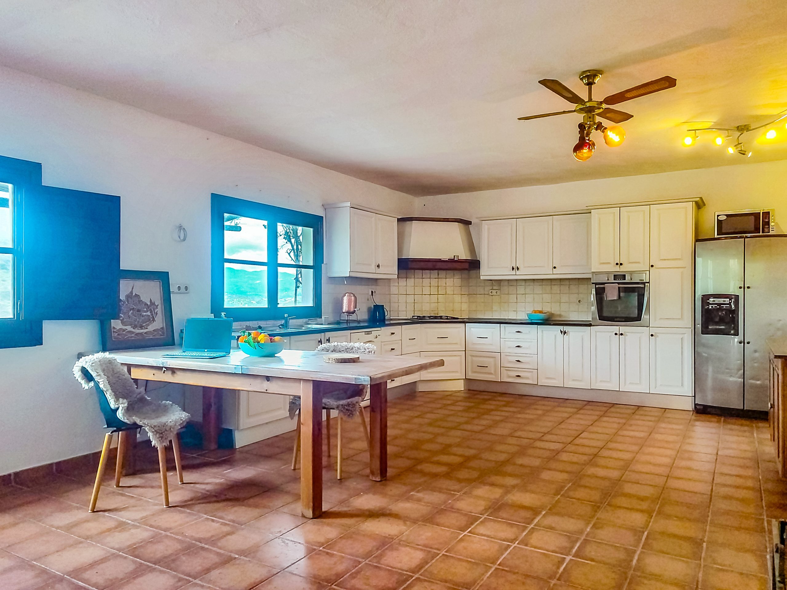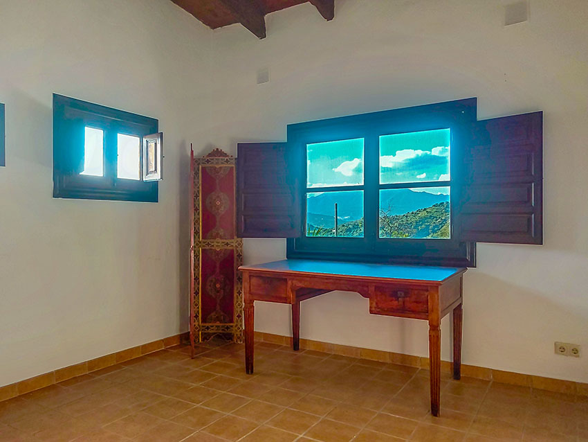 Dentro, la casa tiene cuatro dormitorios dobles, tres son dentro la casa principal y uno esta en el parte trasera de la casa con su patio y baño. El dormitorio principal tiene baño en suite y hay otro baño con bañera y ducha. La habitación principal es un espacio abierto con cocina, comedor y salon en un amplio espacio. La cocina esta completa con horno, lavavajilla, micro-onda y nevera grande, hay ventanas grandes para disfrutar las vistas y la luz, y tiene puertas a las terrazas delante y detrás de la casa. La terraza principal es grande y cubierta. La parcela de 27.000m² esta pendiente hasta un arroyo con cascadas y una piscina natural y tiene un carril de una terraza abajo de la casa donde fue caballos, que llega mas o menos al arroyo. La casa tiene licencia por una casa rural los últimos cinco años. Para visitas whatsapp 0034 722 774 842